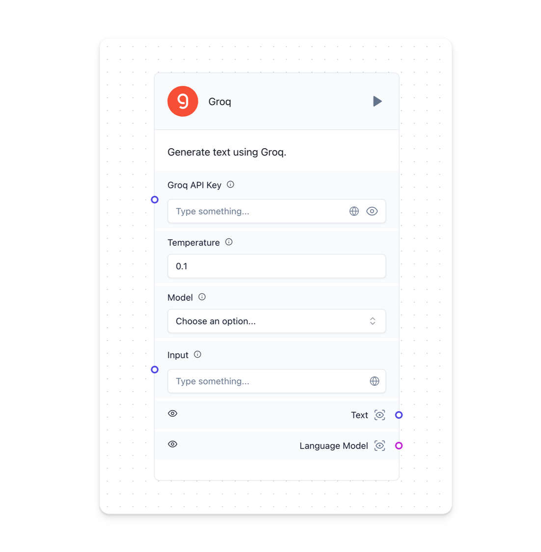 During the flow creation process, you will notice handles (colored circles) attached to one or both sides of a component. These handles use distinct colors to indicate the types of inputs and outputs that can be interconnected. Hover over a handle to see connection details.