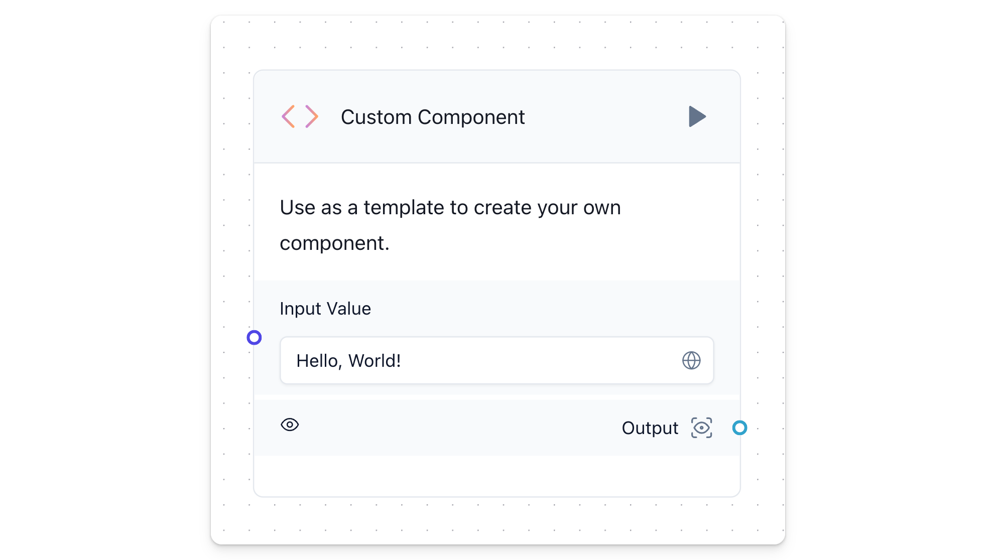 _25# from langflow.field_typing import Data_25from langflow.custom import Component_25from langflow.io import MessageTextInput, Output_25from langflow.schema import Data_25_25_25class CustomComponent(Component):_25 display_name = "Custom Component"_25 description = "Use as a template to create your own component."_25 documentation: str = "http://docs.langflow.org/components/custom"_25 icon = "custom_components"_25 name = "CustomComponent"_25_25 inputs = [_25 MessageTextInput(name="input_value", display_name="Input Value", value="Hello, World!"),_25 ]_25_25 outputs = [_25 Output(display_name="Output", name="output", method="build_output"),_25 ]_25_25 def build_output(self) -> Data:_25 data = Data(value=self.input_value)_25 self.status = data_25 return data