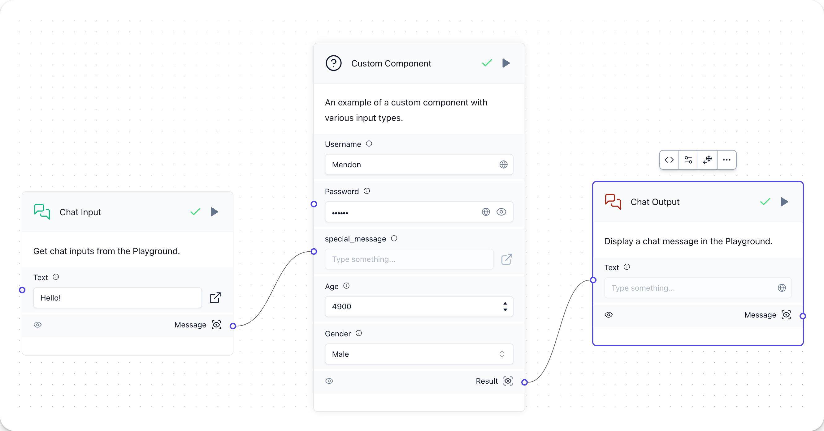 Your Custom Component accepts the Chat Input message through MessageTextInput, fills in the variables with the process_inputs method, and finally passes the message User Username (Age: 49, Gender: Male) sent the following special message: Hello! to Chat Output.