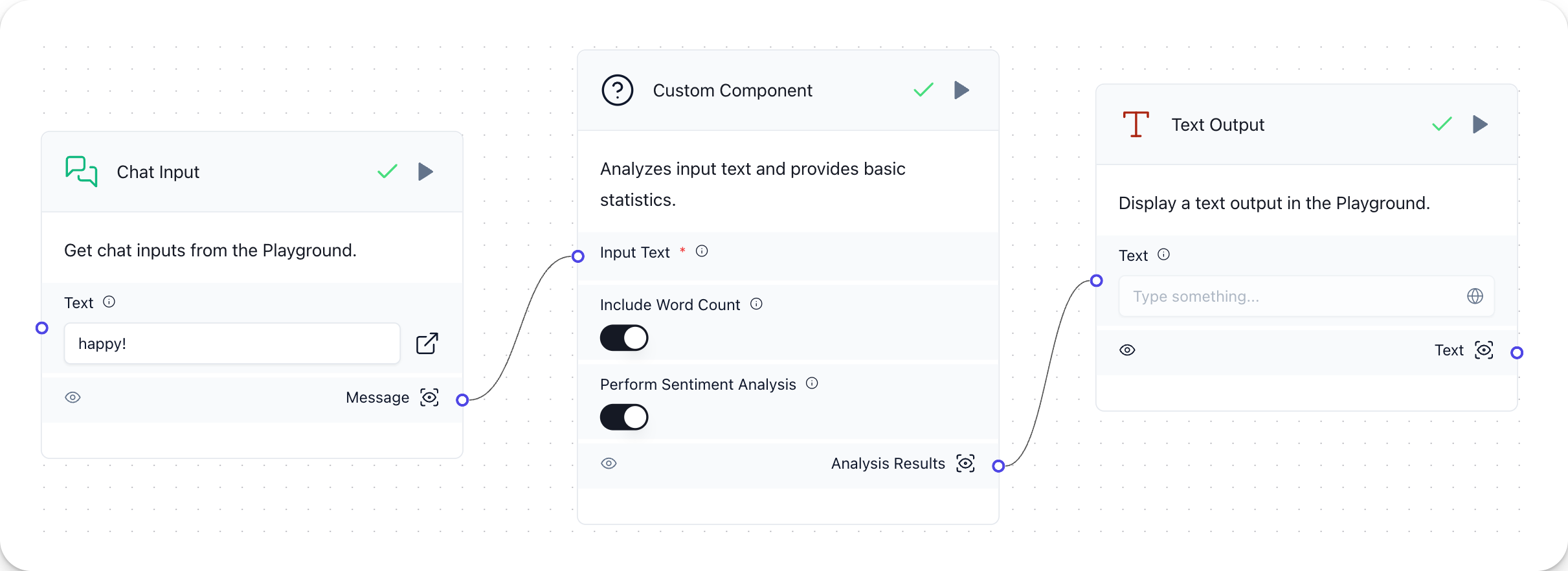 The component performs basic text analysis, including character count and sentence count (based on punctuation marks). If word count is enabled, it splits the text and counts the words. If sentiment analysis is enabled, it performs a simple keyword-based sentiment classification (positive, negative, or neutral).