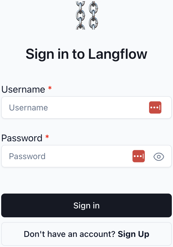 With LANGFLOW_AUTO_LOGIN set to False, Langflow requires users to sign up before they can log in. The sign-up page is the default landing page when a user visits Langflow for the first time.