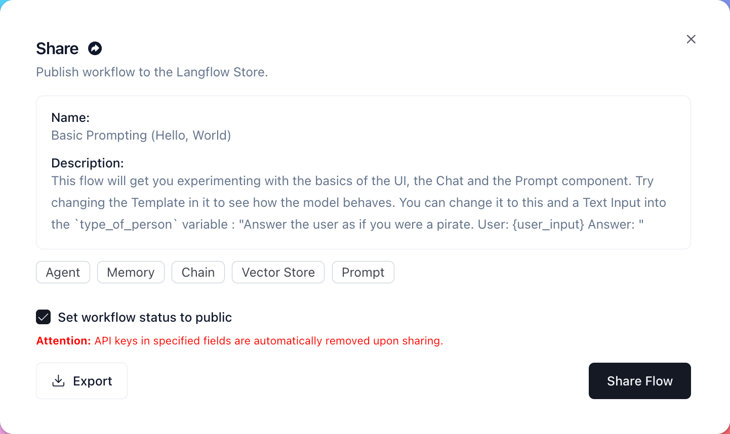 To deploy your amazing component directly to the Langflow store, without it being merged into the main source code, navigate to your flow, and then click Share. The share window appears: