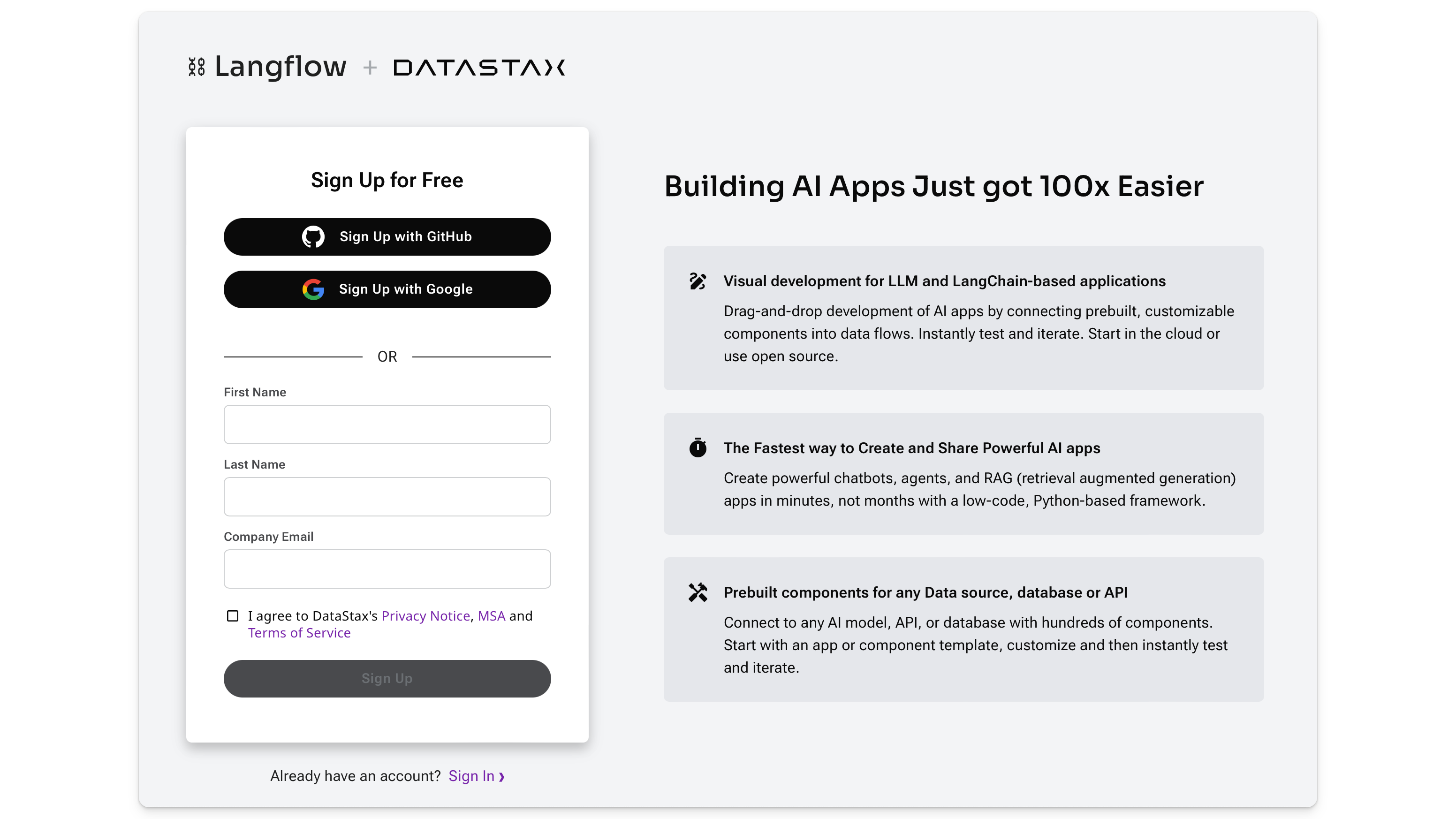 DataStax Langflow is a hosted version of Langflow integrated with Astra DB. Be up and running in minutes with no installation or setup required. Sign up for free.