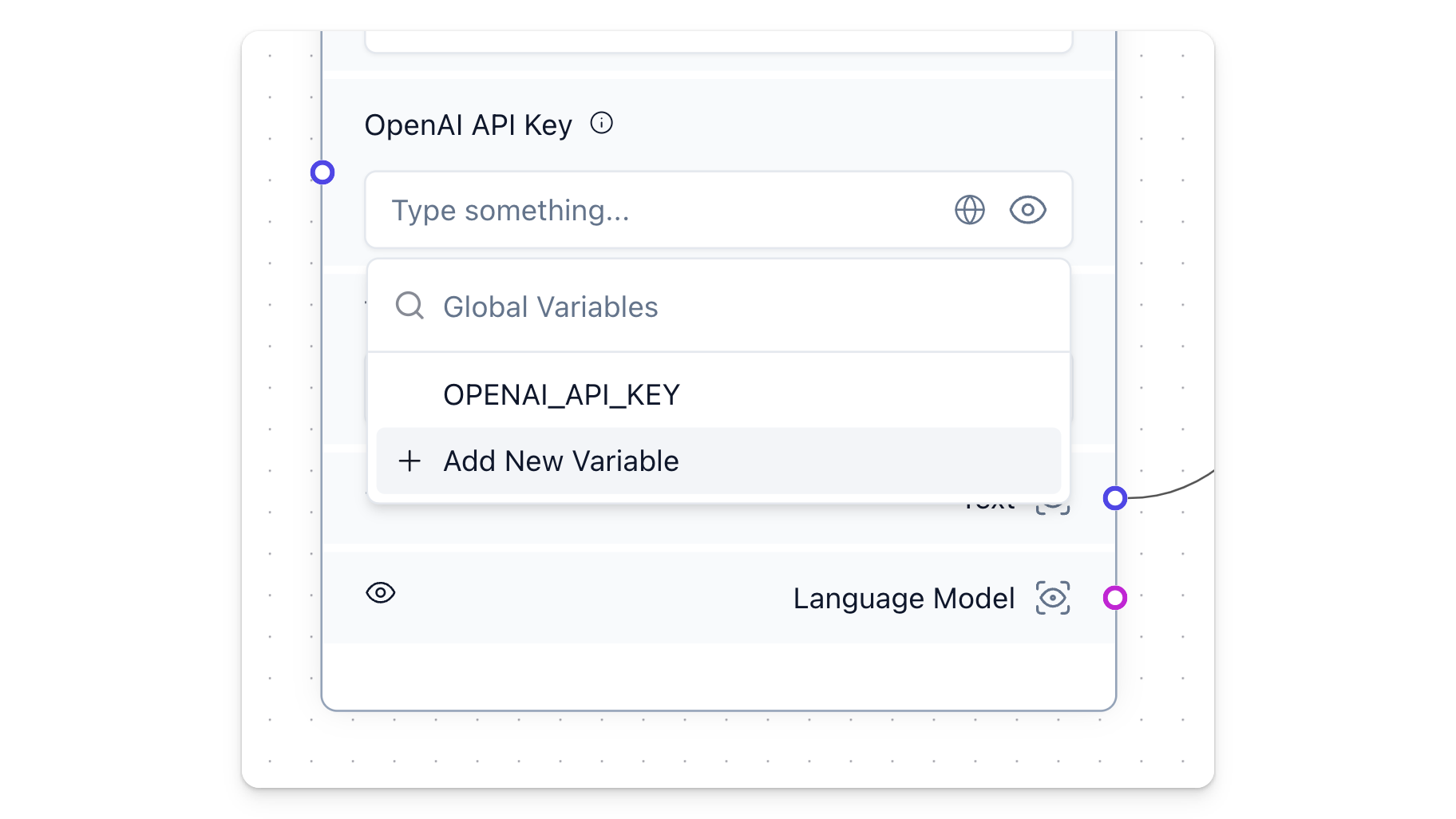 To create an environment variable for the OpenAI component, in the OpenAI API Key field, click the Globe button, and then click Add New Variable.