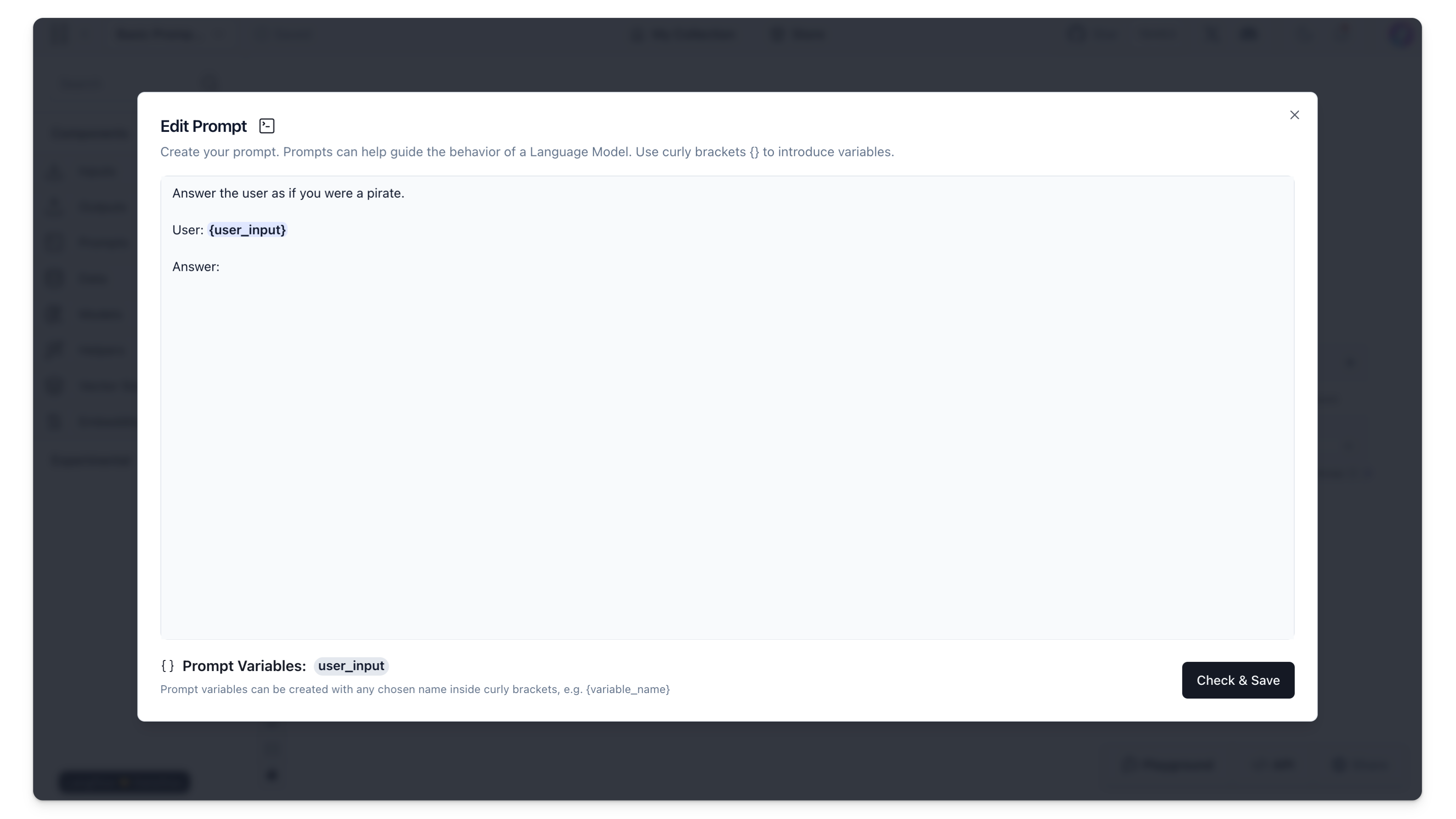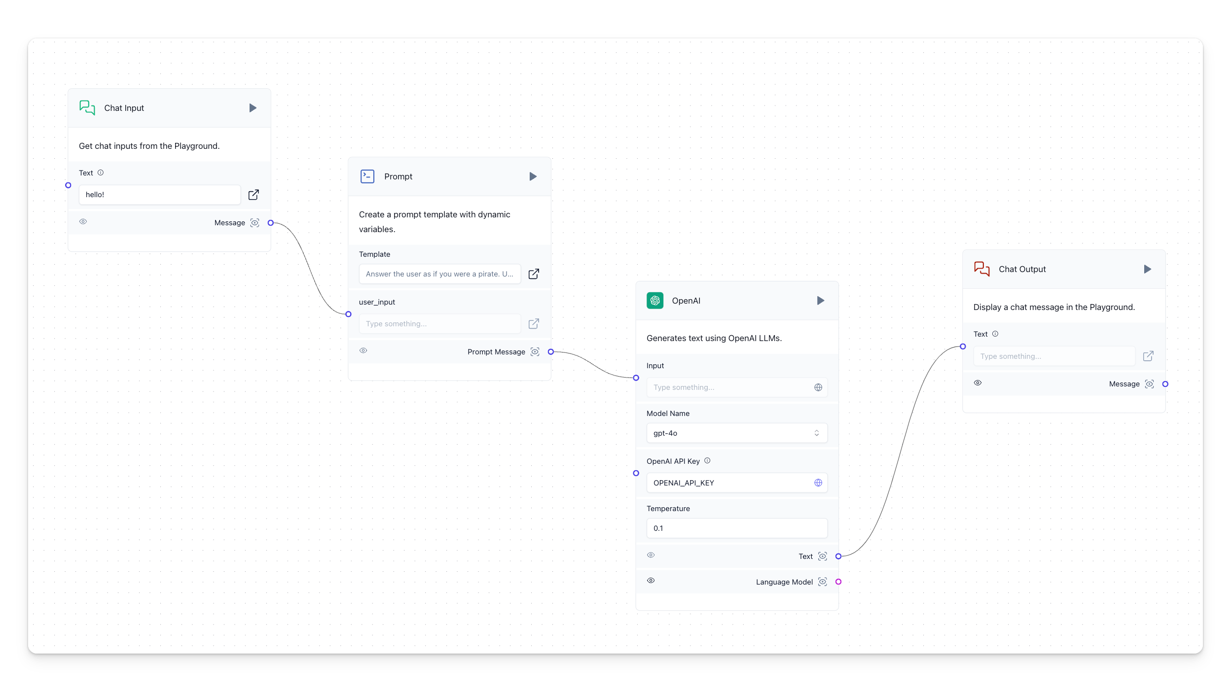 Examine the Prompt component. The Template field instructs the LLM to Answer the user as if you were a pirate. This should be interesting...