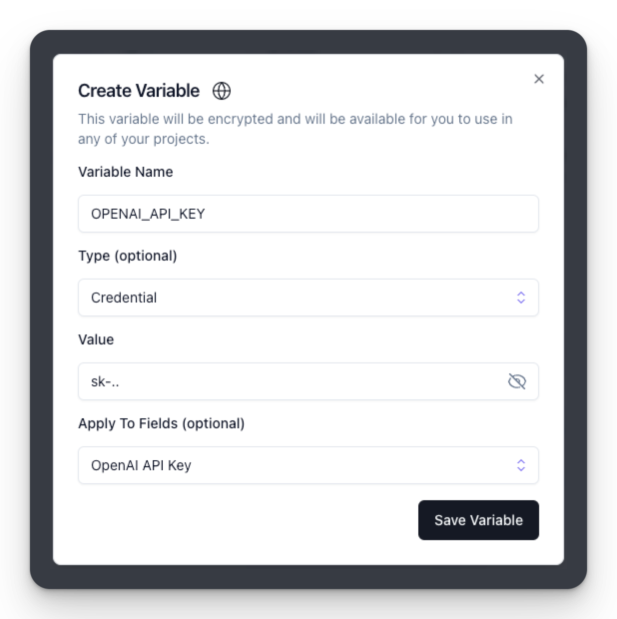 openai_api_keyin the Variable Name field. - Paste your OpenAI API Key (