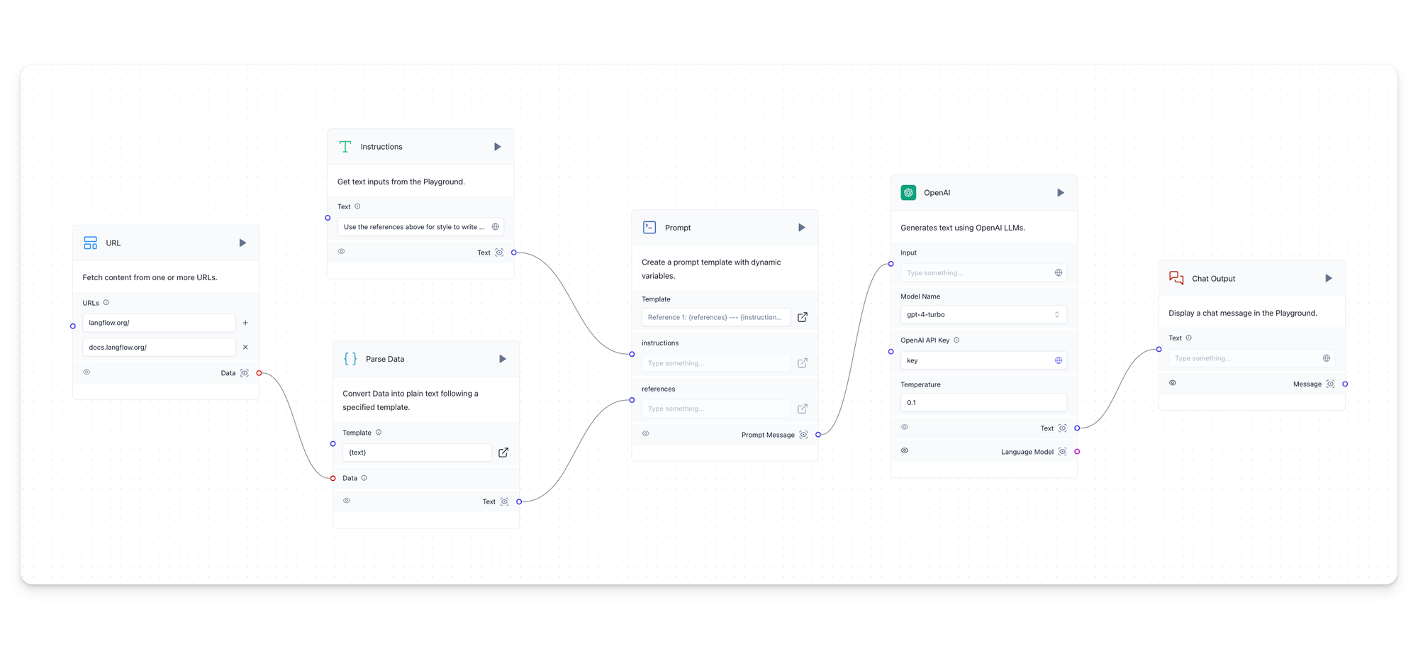 - Parse Data converts the data coming from the URL component into plain text to feed a prompt.