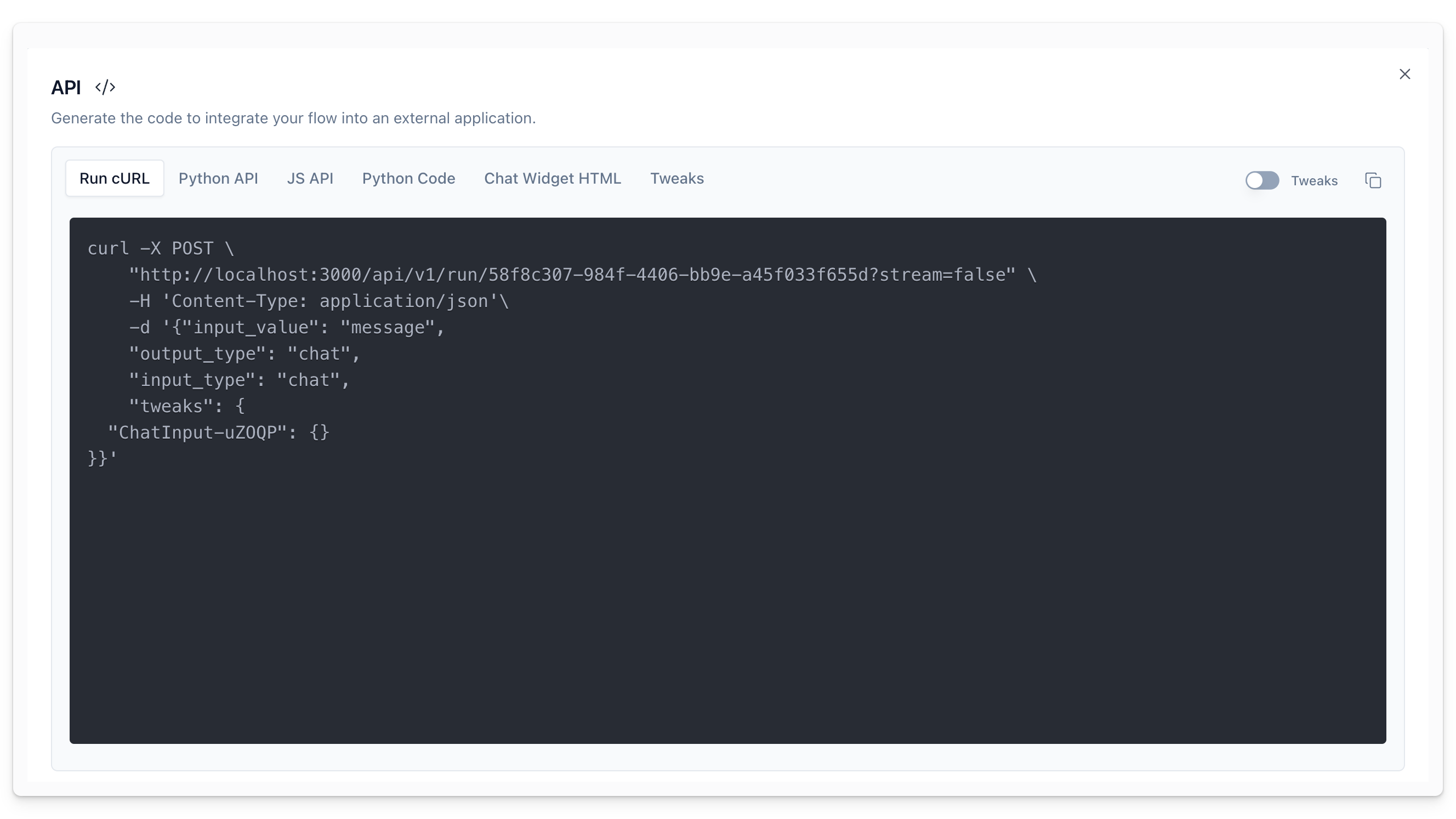 | tweaks | JSON | No | Applies additional custom adjustments for the associated flow. |