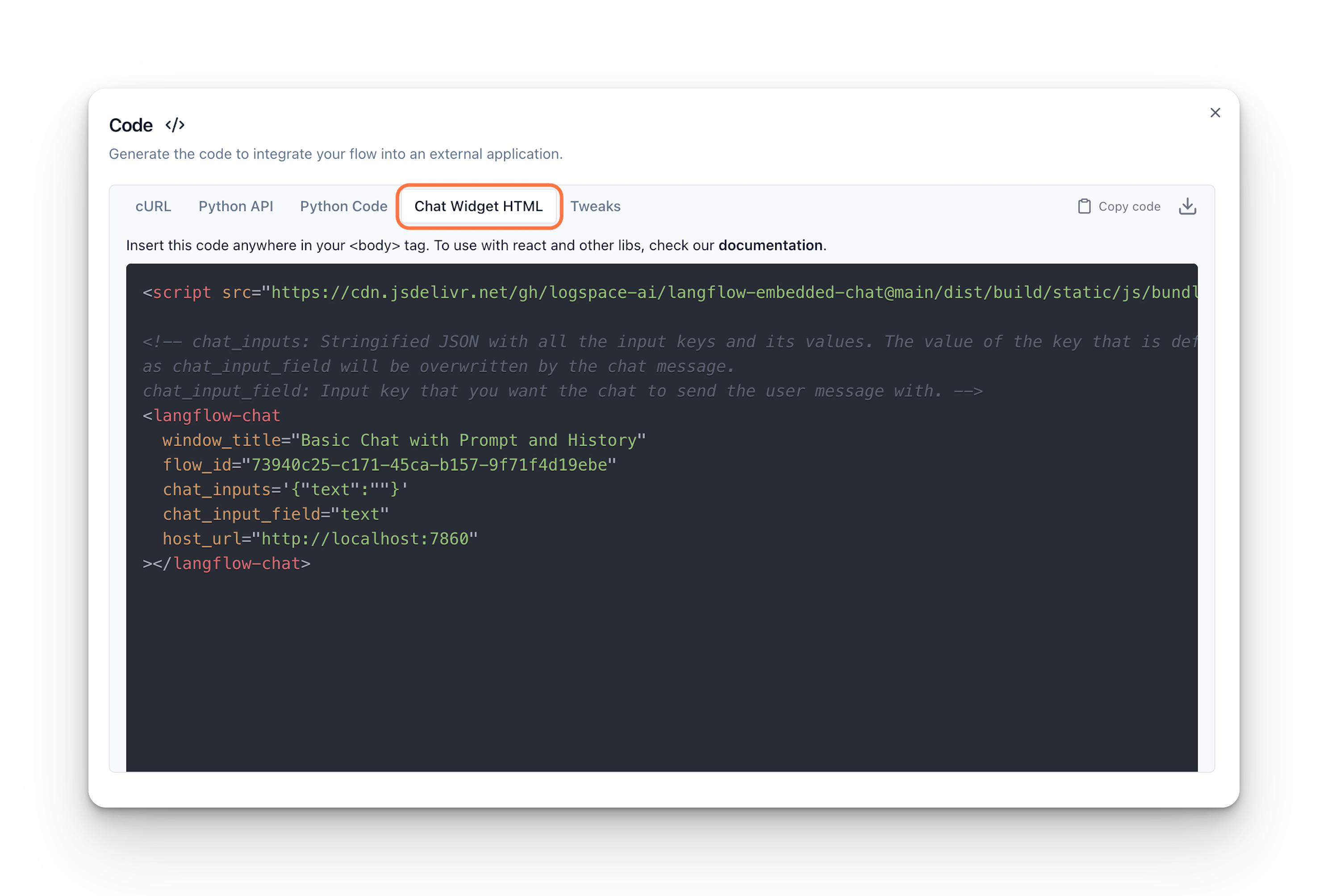 You can get the HTML code embedded with the chat by clicking the Code button at the Sidebar after building a flow.